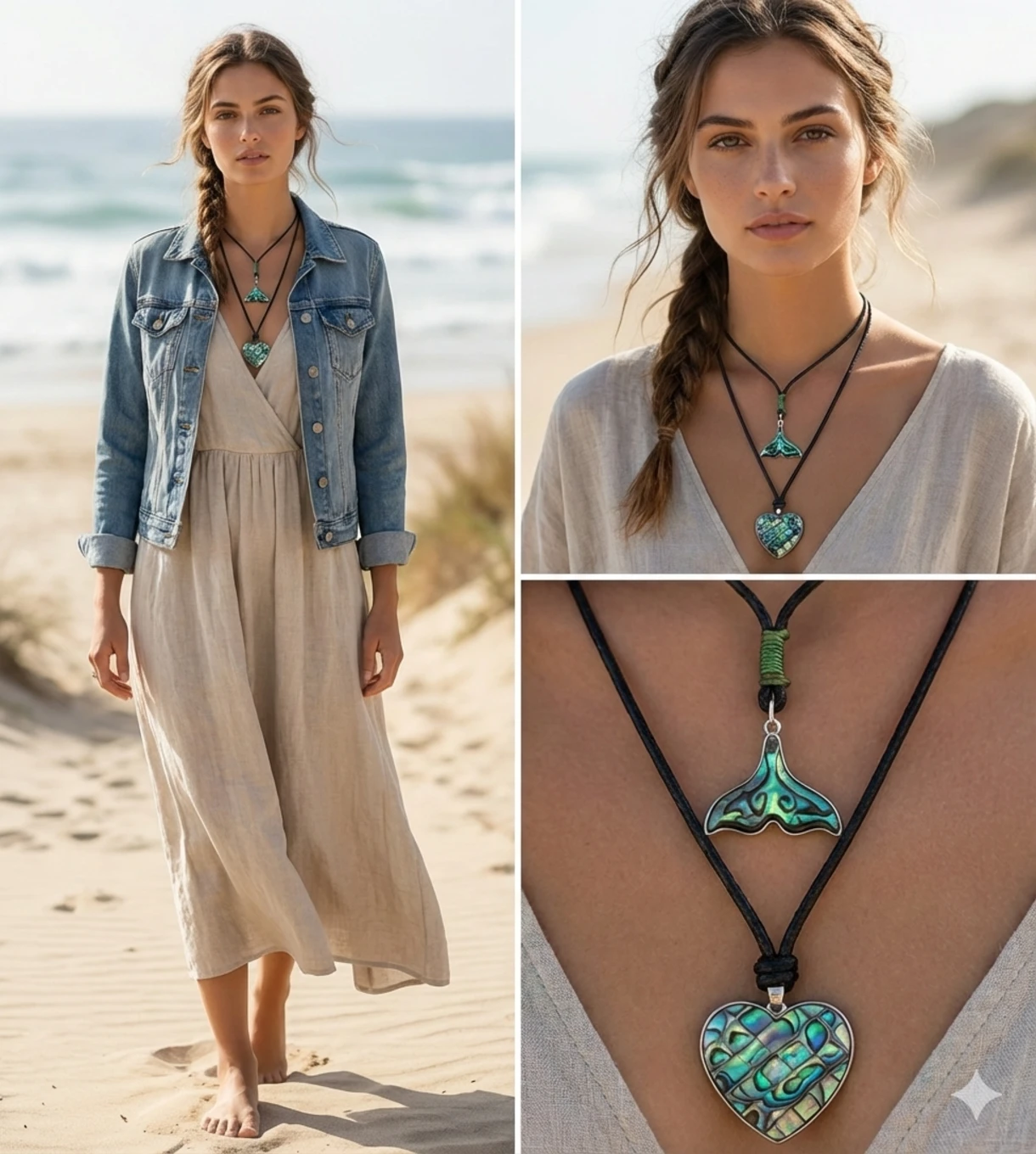 עיצוב דו-שכבתי על חוט שחור עם תליון לב מרכזי במרקם טורקיז עמוק ותליון משלים דמוי זנב. שילוב גוונים קרירים עם מסגרת מתכתית יוצר עומק וברק טבעי ומראה בוהו בעל נוכחות.