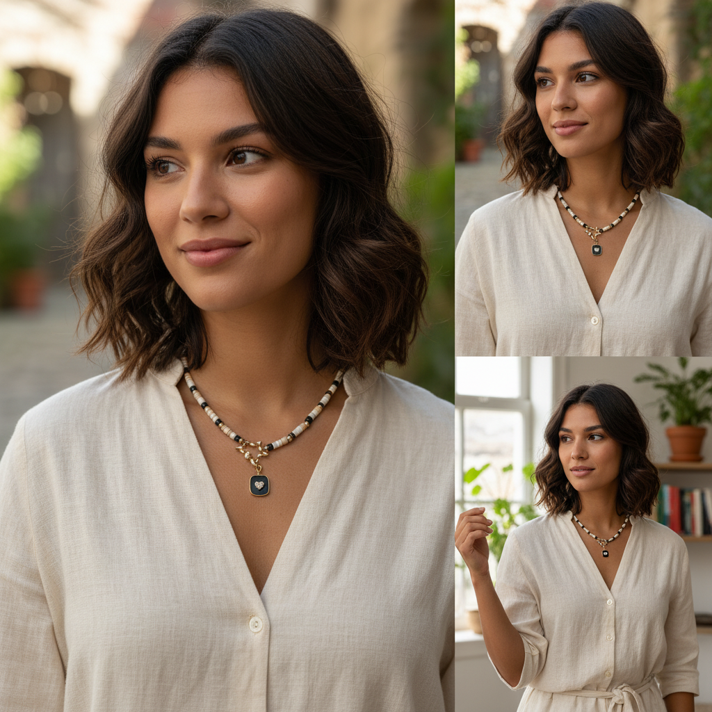 שרשרת "אוריאן" היא יצירה מתוחכמת עם דגש על הפרטים הקטנים. שילוב החרוזים הבהירים והכהים יוצר מראה אלגנטי ורב-ממדי. תליון האמייל השחור, הממוסגר בזהב, מספק קונטרסט מודרני, והלב המנצנץ מוסיף נגיעה רומנטית. השרשרת יושבת במיקום מושלם ללבישה יומיומית, והיא מהווה פריט 1 מכל 1 שמבטא תחכום וסטייל אישי.