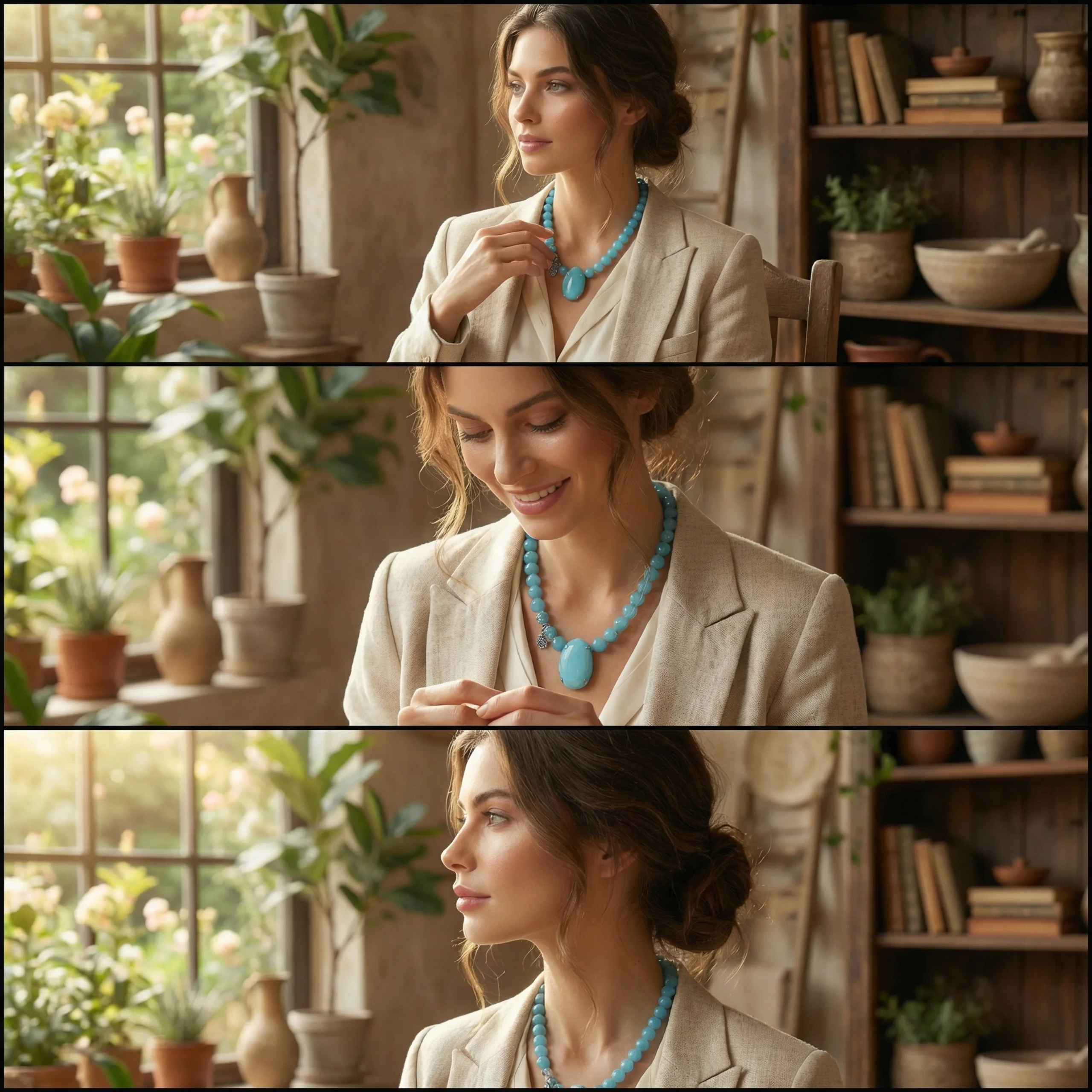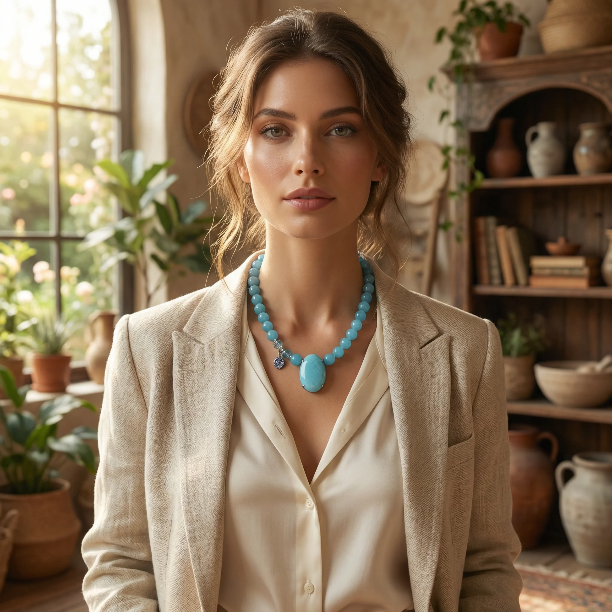 חרוזי טורקיז עגולים מלווים אבן מרכזית דומיננטית ותליון קטן נוסף. מראה חי וקייצי עם נוכחות בולטת.