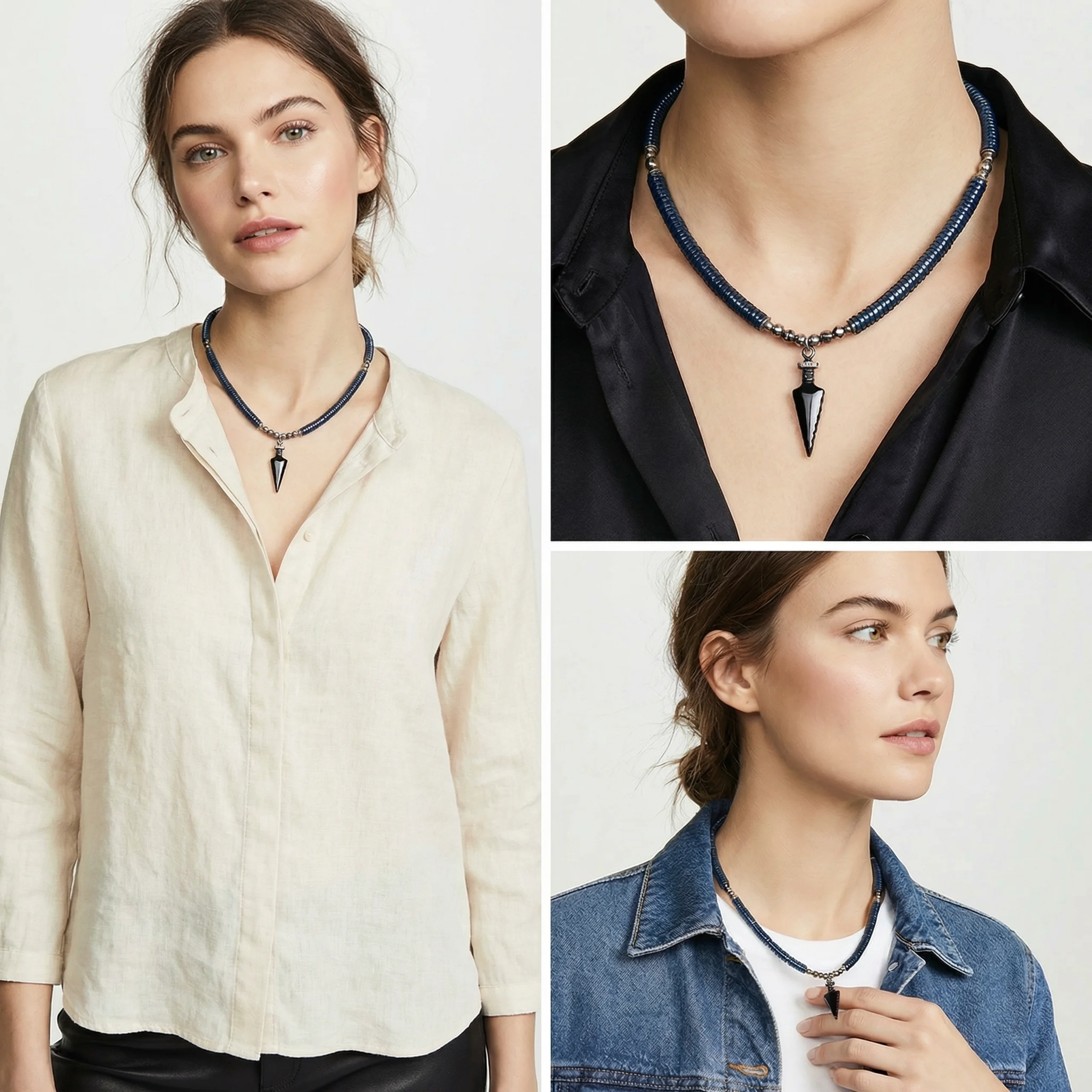 "אורי" הוא דגם שמשדר נוכחות אופנתית. חרוזי המטייט הצילינדריים בגימור כחול חשמלי יוצרים טקסטורה נועזת. תליון הלהב/חץ המושחר הוא סמל לכוח. זהו פריט אלגנטי, מינימליסטי ובעל אמירה חדה.
