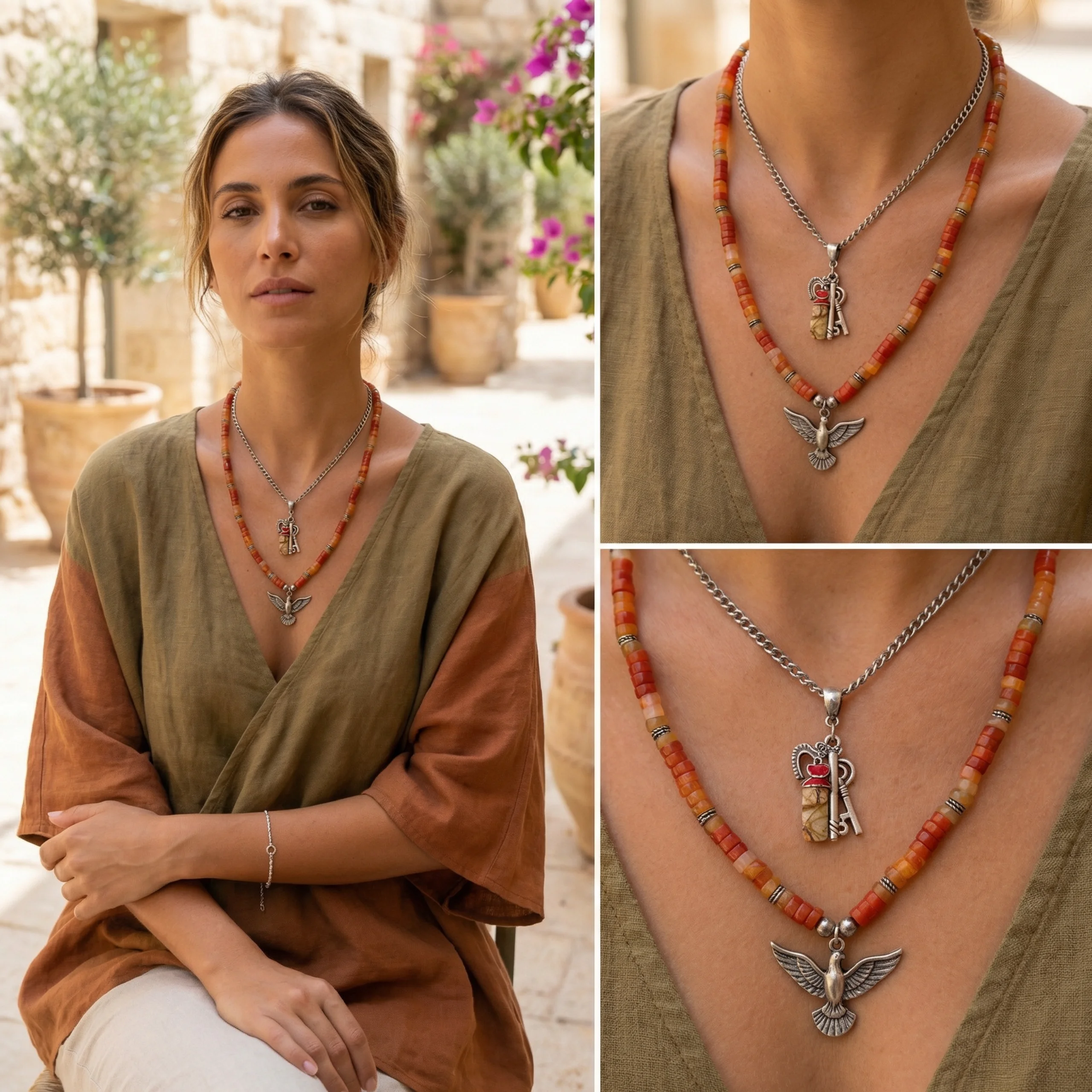 גווני אדמה משתלבים עם תליון יונה ותליון מפתח עדין. עיצוב עשיר בפרטים עם תחושת עומק ותנועה.
