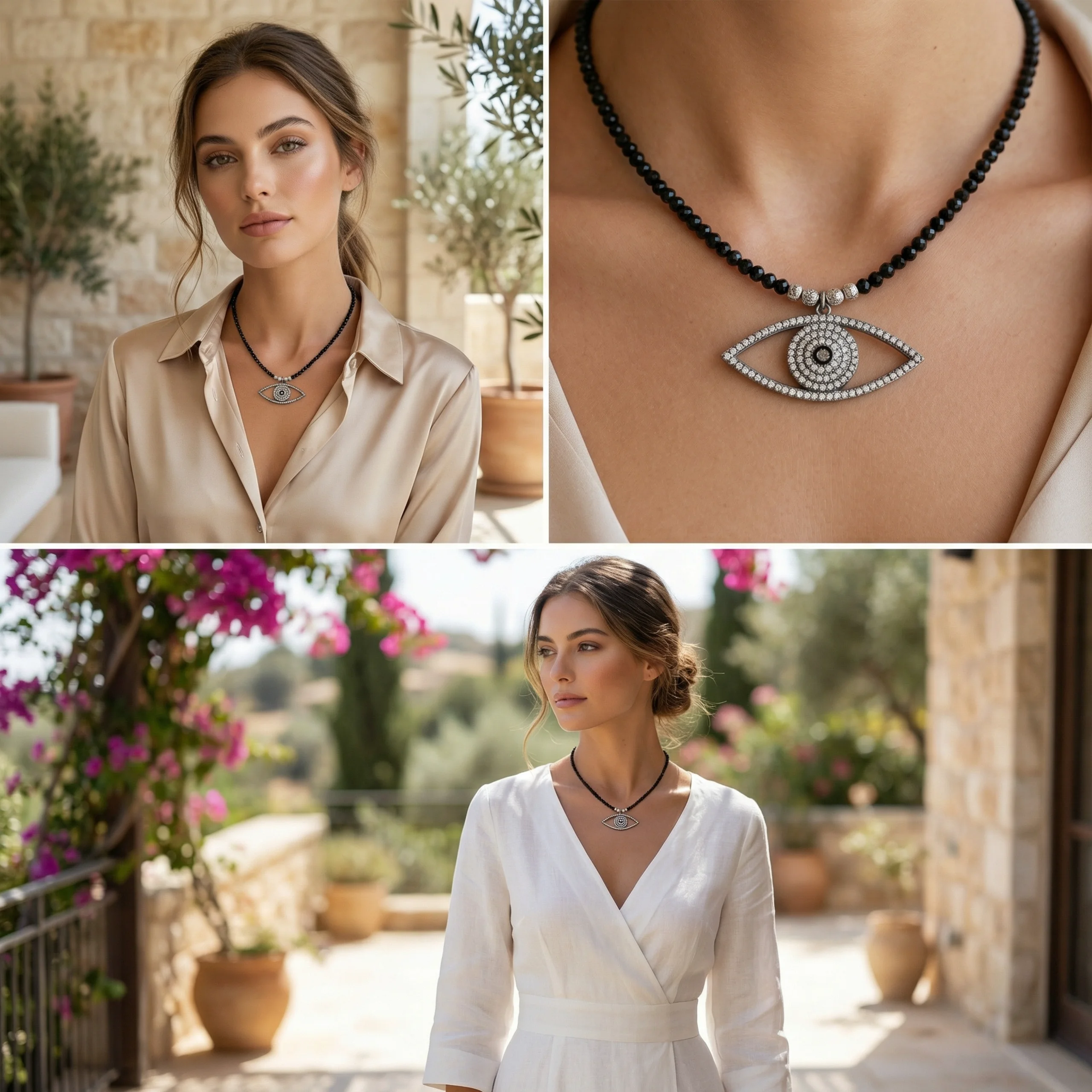 דגם "ארבל" הוא שילוב מושלם של טרנד ואמונה. השרשרת מורכבת מחרוזים שחורים מבריקים שיושבים קרוב לצוואר, ומדגישים את תליון העין הגדול והמרכזי. התליון משובץ באבני קריסטל נוצצות היוצרות מראה יוקרתי ומלא נוכחות. זוהי יצירה 1 מכל 1, שתעניק לך מגע מודרני ואקלקטי שמתאים לכל עונה ומוסיף נופך של גלאם ייחודי.