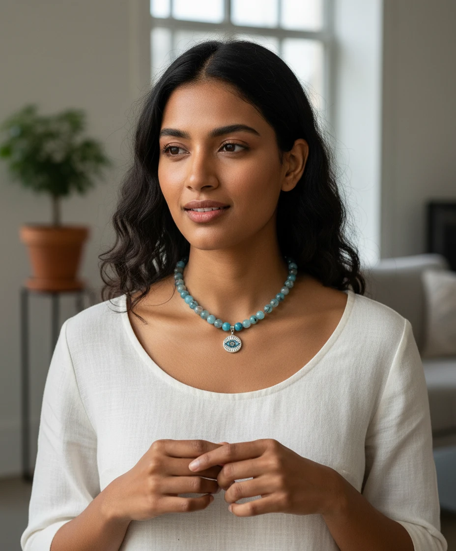 העין של האוקיינוס. שרשרת של אבני אגת כחולה בגימור טבעי, עם תליון עין רע כסופה ומאירה – להגנה אינטואיטיבית.