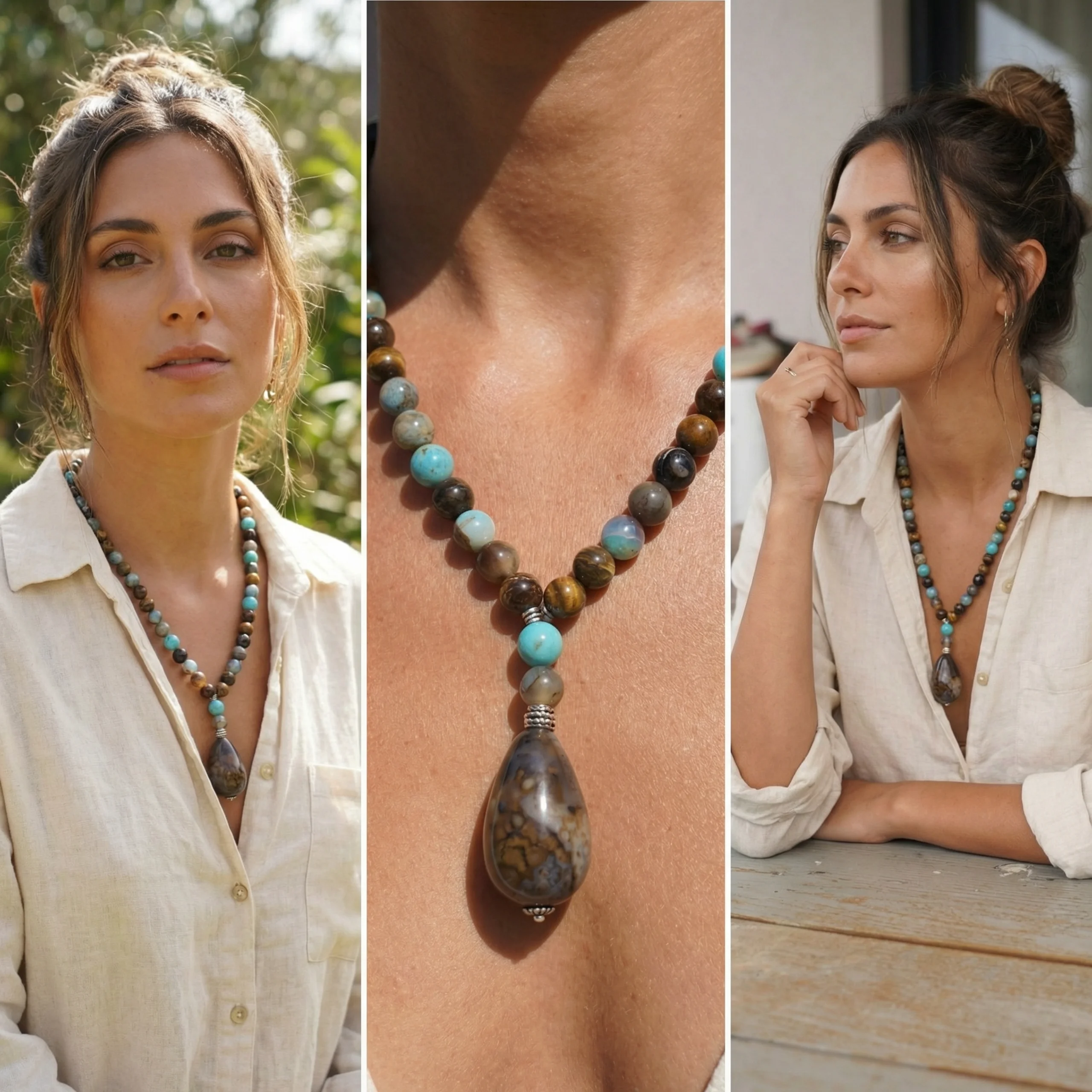שילוב אבנים בגווני אדמה וטורקיז עם תליון אבן טבעית בצורת טיפה. מראה רגוע עם חיבור לטבע.