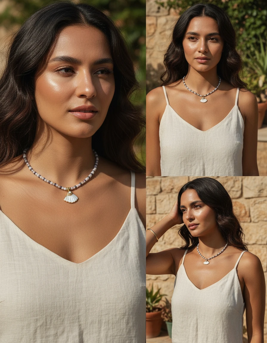 חלוף הזמן. שרשרת אבני חוף בגווני פודרה וסגול עמום, עם תליון צדף מניפה ממוסגר זהב ואופל – שיק עתיק ורומנטי.