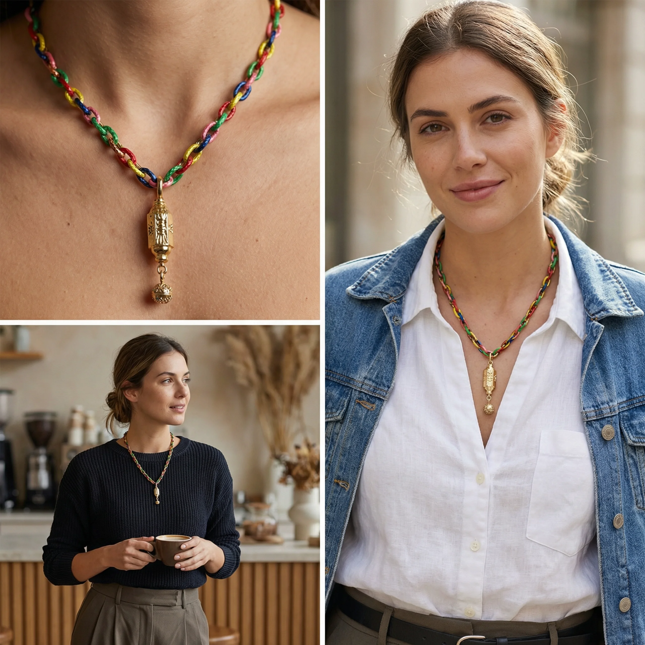 דגם "ירדן" הוא הדרך שלך לשבור את השגרה. השרשרת עשויה חוליות בולטות, צבועות באמייל צבעוני (אדום, ירוק, כחול) היוצרות מראה ייחודי ורענן. במרכז משתלשל תליון פליז או זהב ארוך ומעוטר, המשלים את המראה הבוהמי-שבטי. זוהי שרשרת 1 מכל 1 המבטיחה שתבלטי בכל מקום, ואידיאלית למי שאוהבת סטייל נועז ומלא חיים.