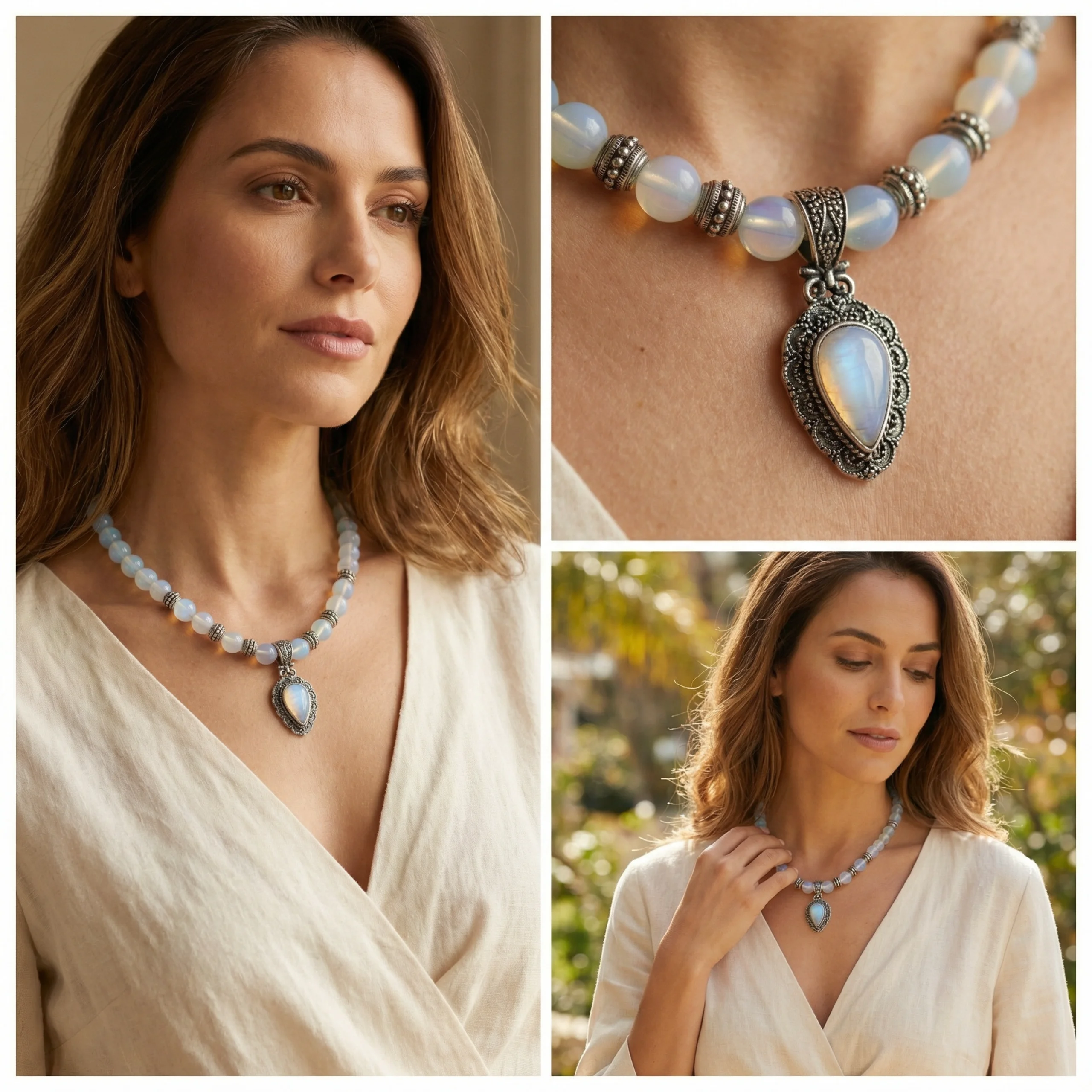 אבנים בגוון חלבי עם תליון מרכזי בעיצוב קלאסי. שילוב עדין בין רכות לאלגנטיות.