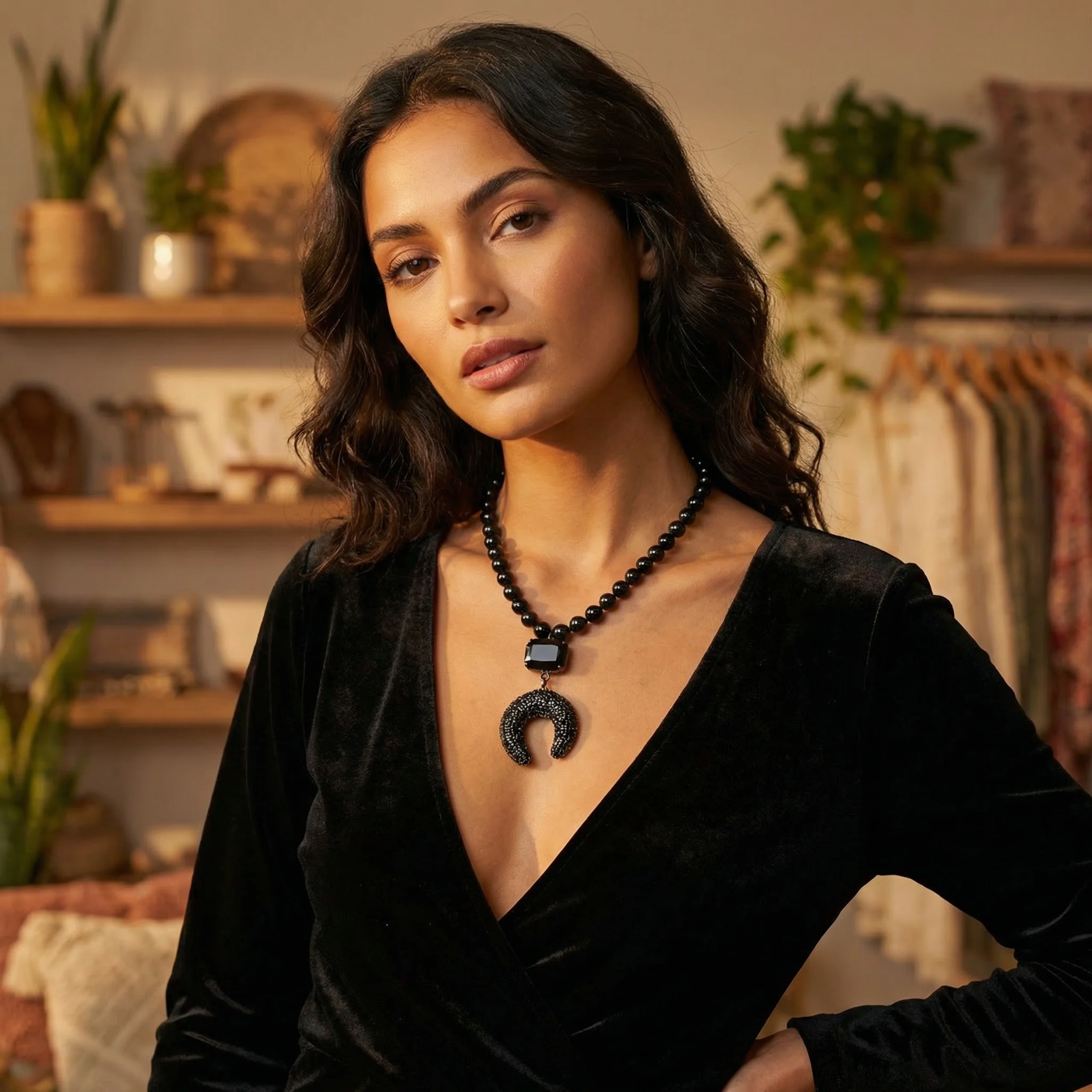 חרוזים שחורים עם תליון חצי סהר נוצץ.