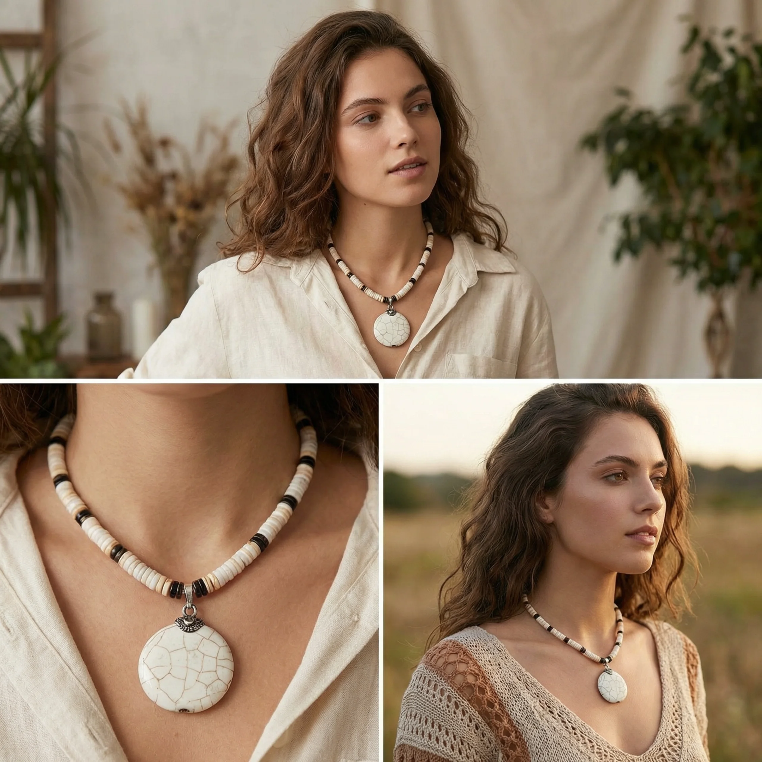 השרשרת "לין" היא מחווה לסטייל המינימליסטי המודרני עם נגיעה של טבע. היא מורכבת מחרוזים פלאטיים בגווני שחור-לבן-קרם, היוצרים קונטרסט מרשים. תליון הדיסק העגול הוא בולט וייחודי, מעוצב בגימור דמוי אבן סדוקה או קרמיקה. זוהי יצירת בוטיק 1 מכל 1, שמשדרת שיק אורבני ומתוחכם, אידיאלית כפריט יחיד המושך את העין.