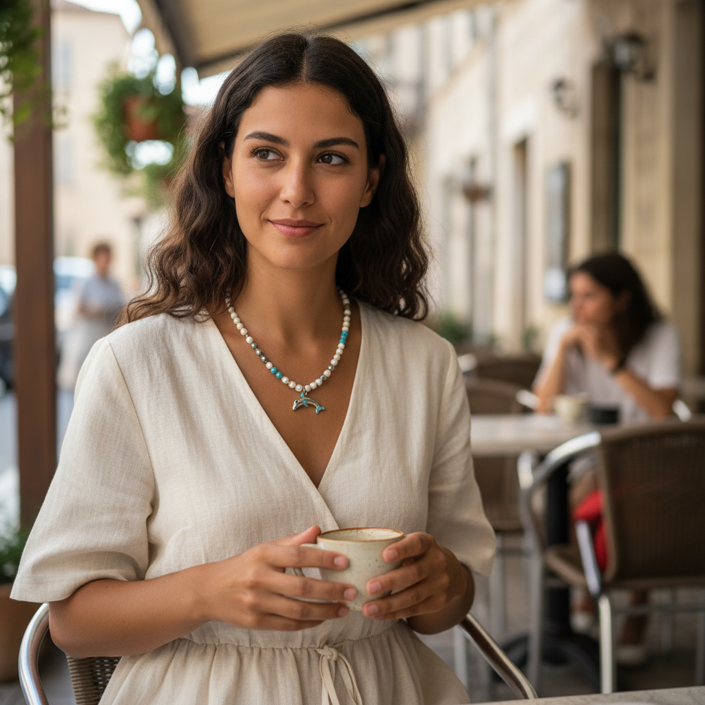 שרשרת "לירי" מביאה את הרוח החופשית של הים. היא מורכבת מחרוזים בהירים (לבן, בז') המשלבים חרוזי טורקיז קטנים כנגיעות גל. תליון הדולפין, משובץ בכמה אבנים כחולות זעירות, מעניק מראה שובב ועדין. זוהי שרשרת 1 מכל 1, קלילה ומושלמת לקיץ וללבישה יומיומית, והיא מהווה תזכורת מתוקה לחופש שבא מן המים.