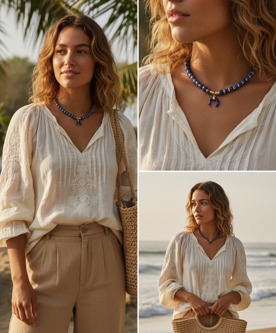 לילה של כוכבים. קולר לאפיס לאזולי בצורת דיסק עם תליון סהר כחול משובץ כוכב זהב – ללוק ירחי ומסתורי.