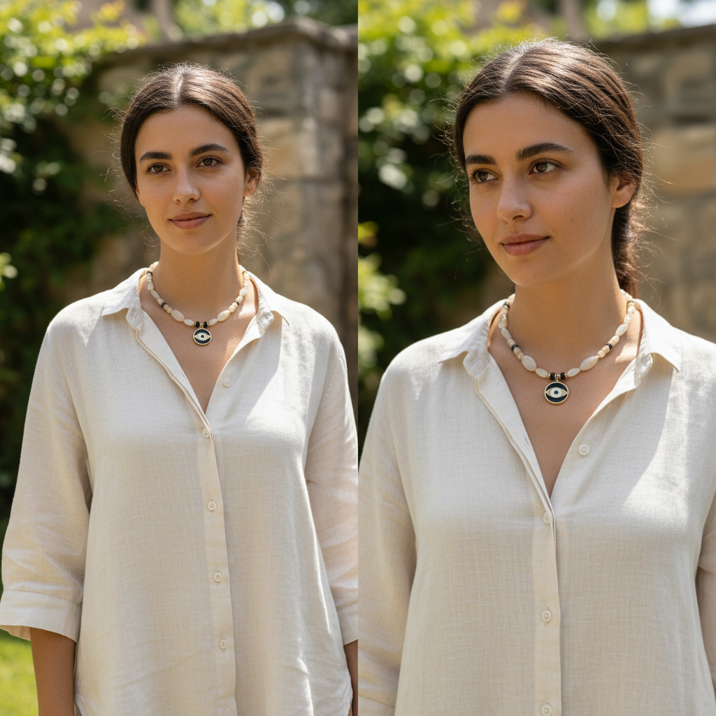 "מילה" היא שרשרת קצרה ואלגנטית, המשלבת חרוזי גלם בגוונים ניטרליים ורכים, המעניקים תחושה טבעית ויוקרתית. תליון העין הכחולה במרכז, הממוסגר בזהב, מוסיף עניין ומשמעות עמוקה. הניגוד בין גווני האבן הבהירים והתליון הדרמטי יוצר סטייל מתוחכם. יצירה 1 מכל 1 זו היא קלילה מספיק ליום-יום, ועם זאת מספקת תוספת שיק מיידית לכל הופעה.