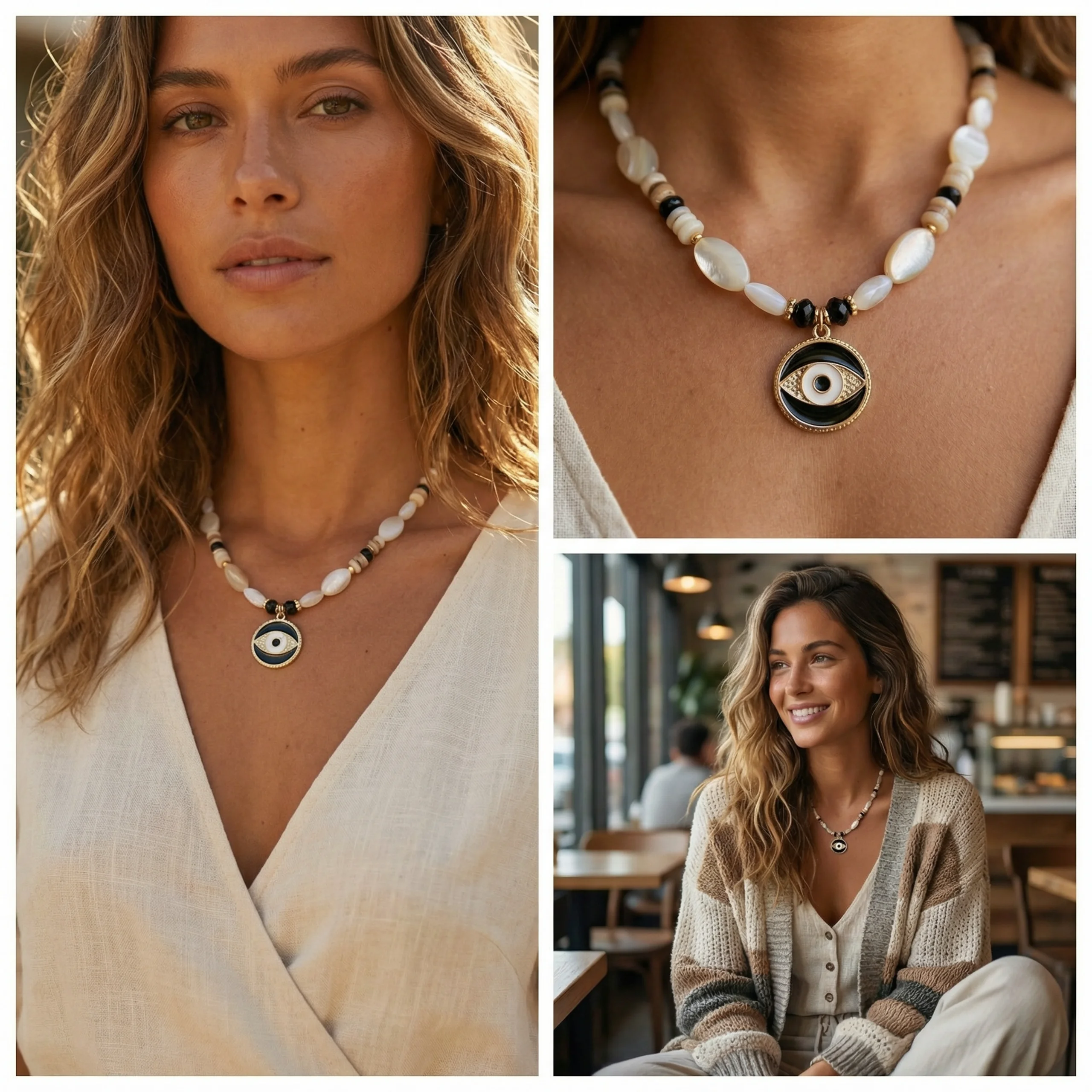 "מילה" – שרשרת חרוזים בגווני בז', אפור ושחור, עם תליון עגול של עין כחולה.