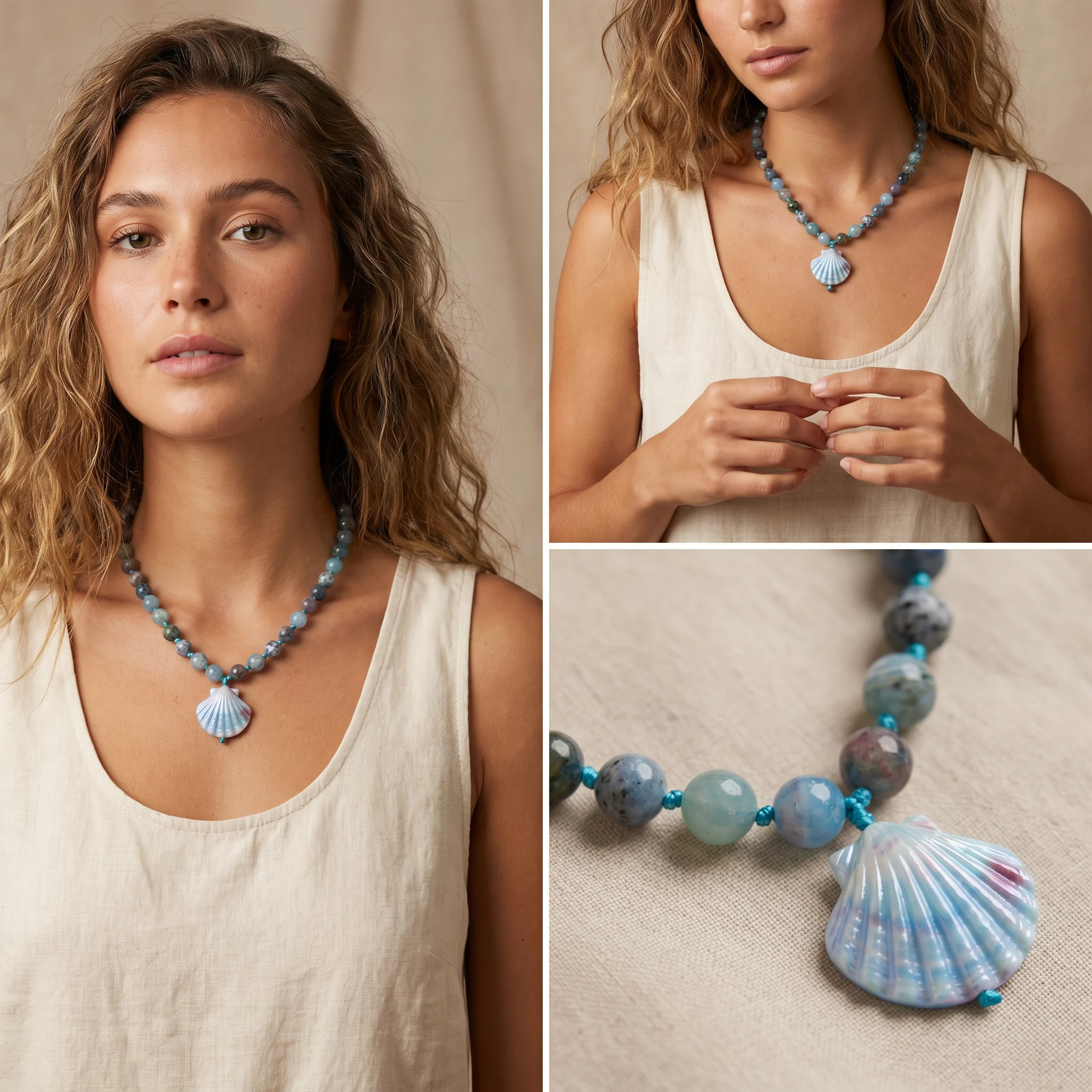 החרוזים בגווני כחול משתלבים בהרמוניה עם תליון צדף ייחודי.