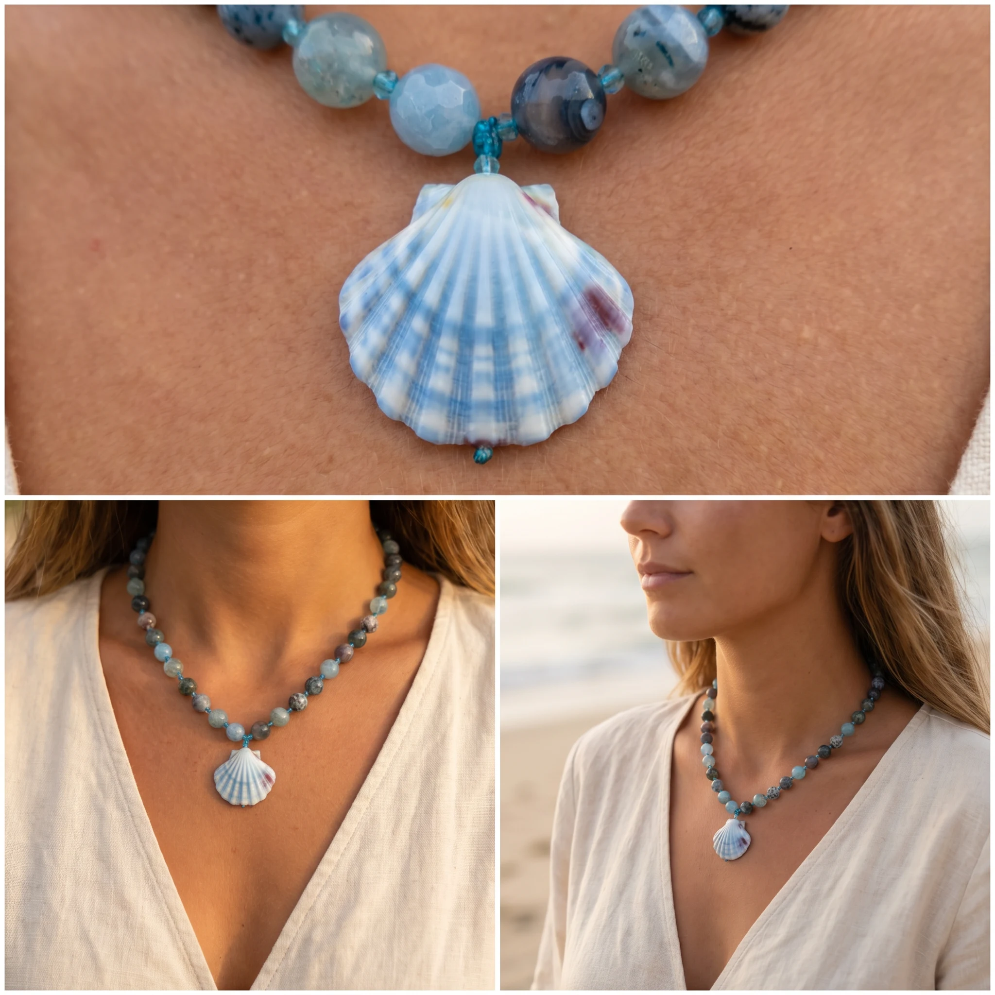 שרשרת בגווני כחול עם תליון צדף טבעי.