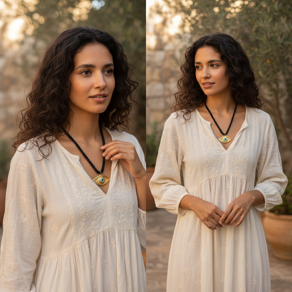 "מיתר" היא שרשרת הצהרה עוצמתית המשלבת עבודת צורפות מורכבת. השרשרת עשויה חוט קלוע עבה בצבע שחור, היוצר רקע דרמטי לתליון העין המוזהב והבולט. תליון העין מעוצב בטקסטורה עשירה ומפורטת, ומשובץ באבן טורקיז עמוקה בתוך גלגל העין. יצירת 1 מכל 1 זו היא פריט אופנתי בעל משמעות עמוקה, מושלם לשדרוג כל לוק קלאסי.