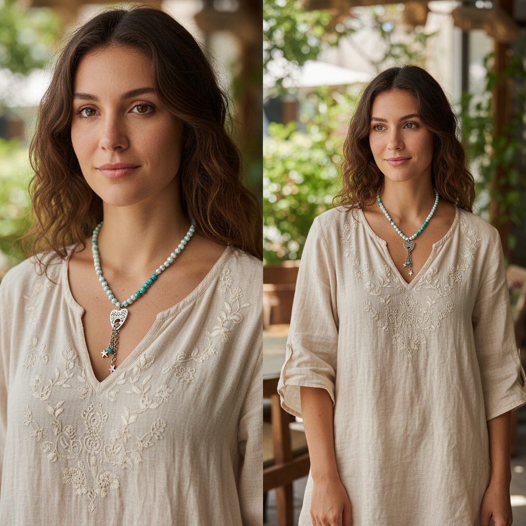 דגם "נוגה" הוא שרשרת קסומה המשלבת רוך וסטייל מיוחד. השרשרת עשויה חרוזים בעלי טקסטורה מרוקעת בצבע טורקיז חיוור, המשתלבים ללב כסף גדול ומפורט. מהלב משתלשלים שני כוכבי כסף קטנים המעניקים תנועה. זוהי יצירת בוטיק 1 מכל 1, עם אופי נשי וייחודי, מושלמת למי שמחפשת תכשיט שמספר סיפור אישי ועמוק.