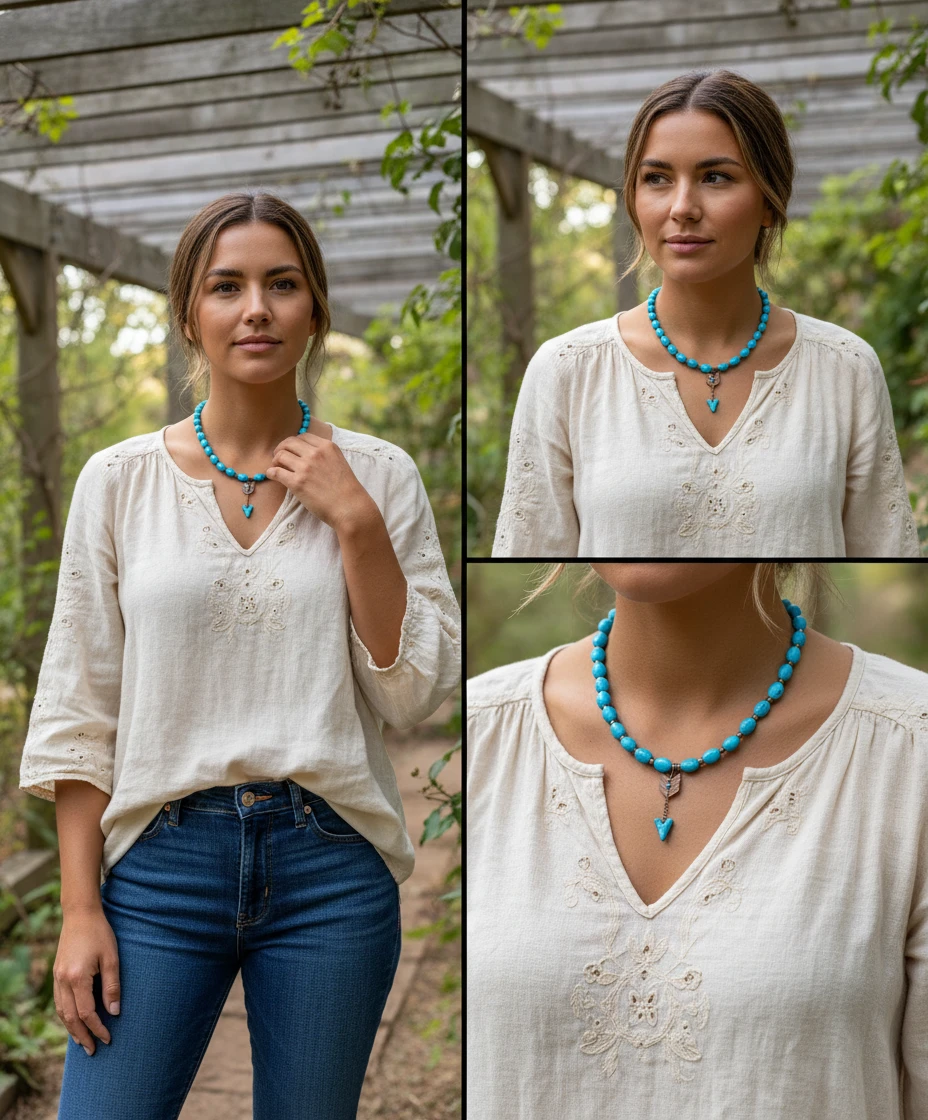 השבט הכחול. קולר טורקיז בהיר ואובלי, עם תליון חץ בשילוב עץ וטורקיז – לחיבור לאדמה.