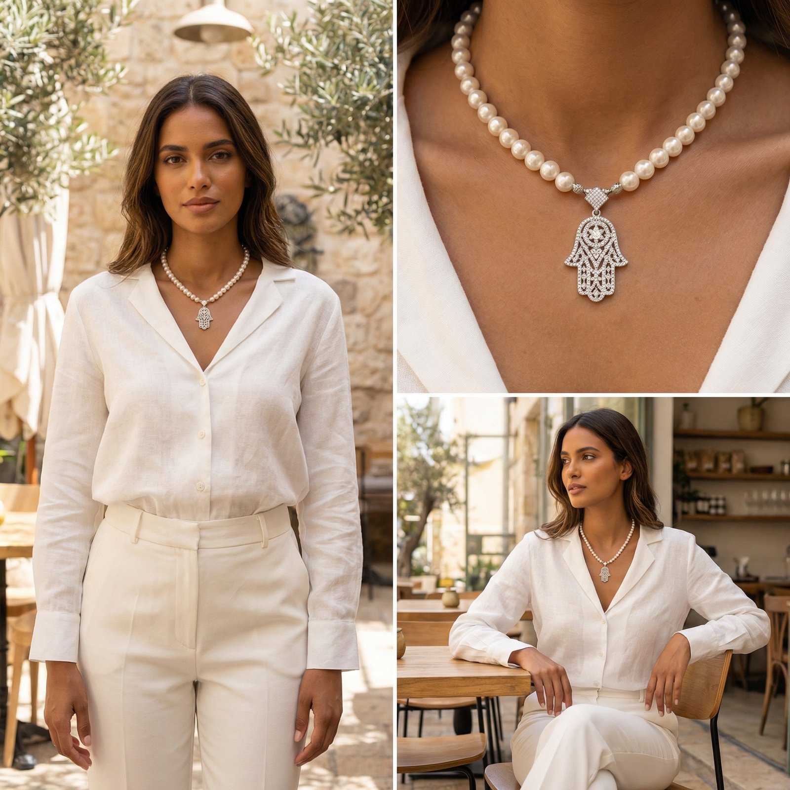 פנינים לבנות קלאסיות מודגשות בחמסה כסופה נוצצת. שילוב אלגנטי ונקי.