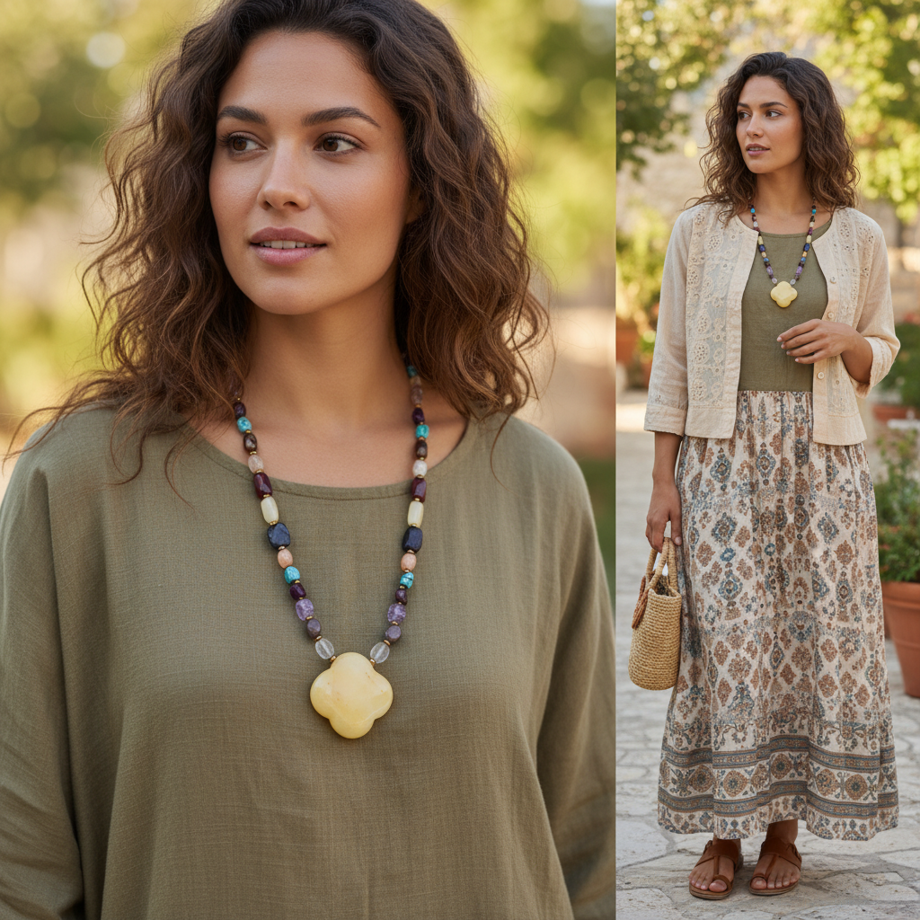 "סהר" – שרשרת אבני חן צבעוניות גדולות (אבני גלם) עם תליון מרכזי גדול דמוי פרח בצבע צהוב-דבש.