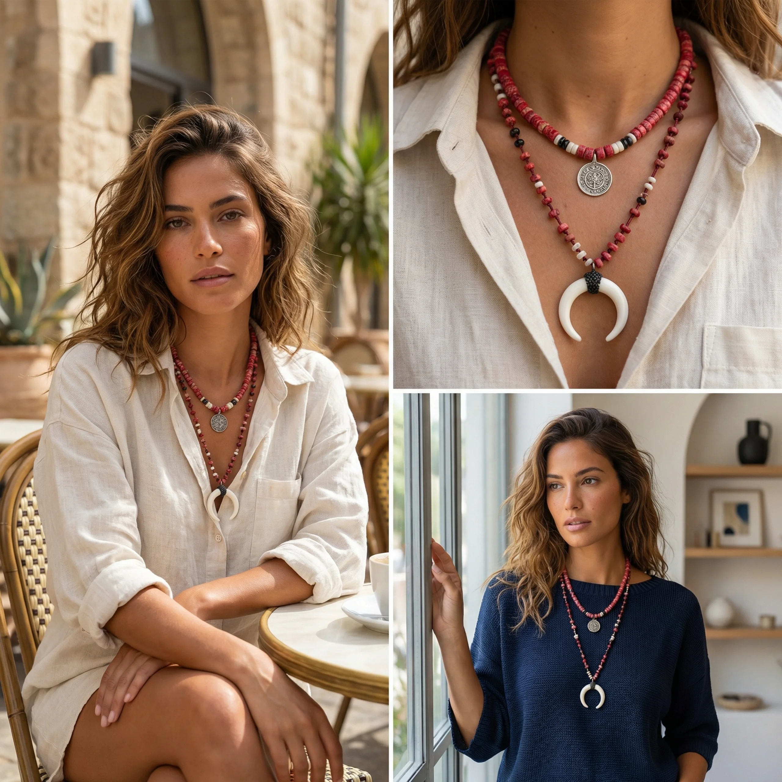 שרשרת שכבות ורודות עם מטבע וקריסטל חצי ירח.