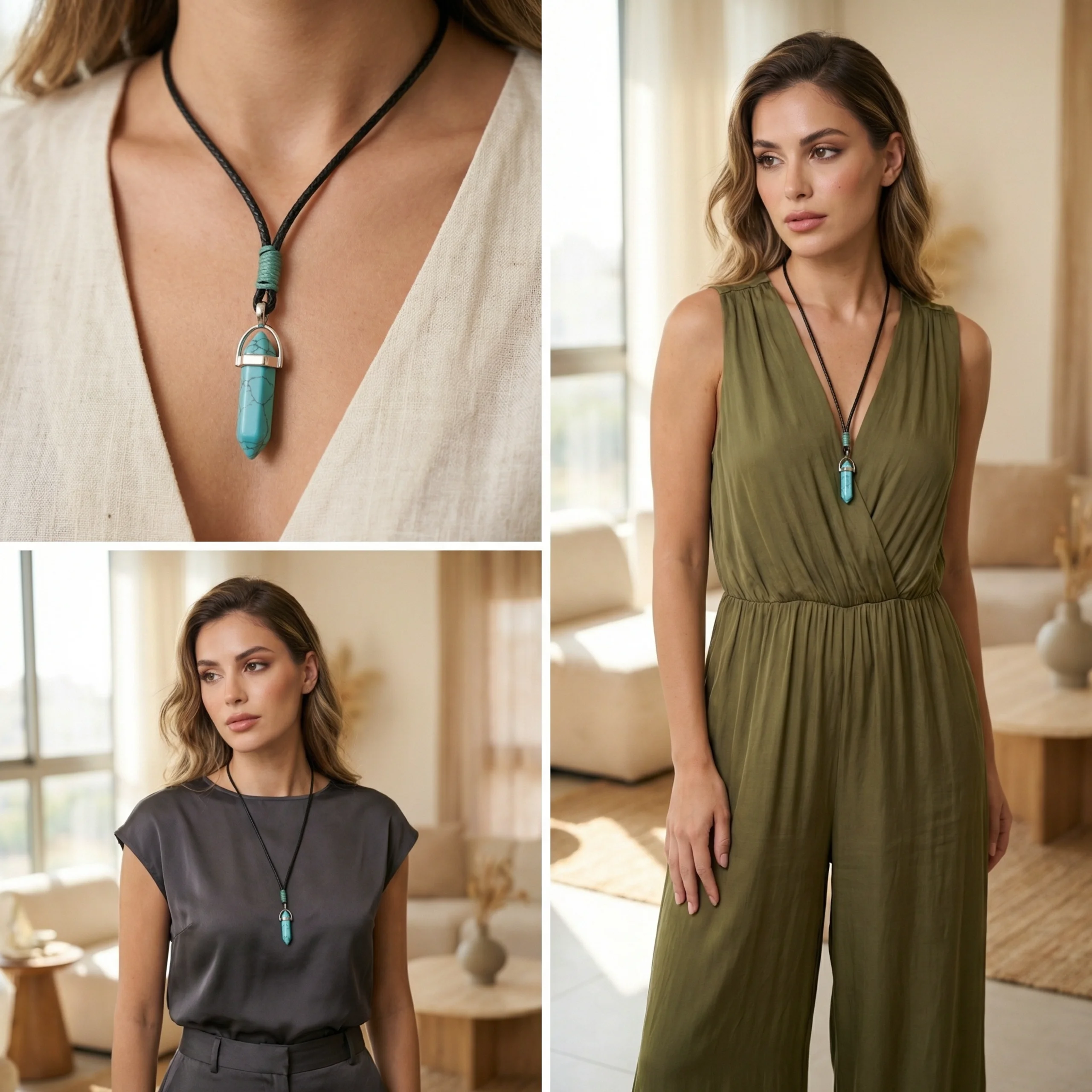 תליון אבן טורקיז מוארכת בגימור מתכתי תלוי על חוט שחור מינימליסטי. עיצוב נקי עם מוקד צבע חזק וברור.