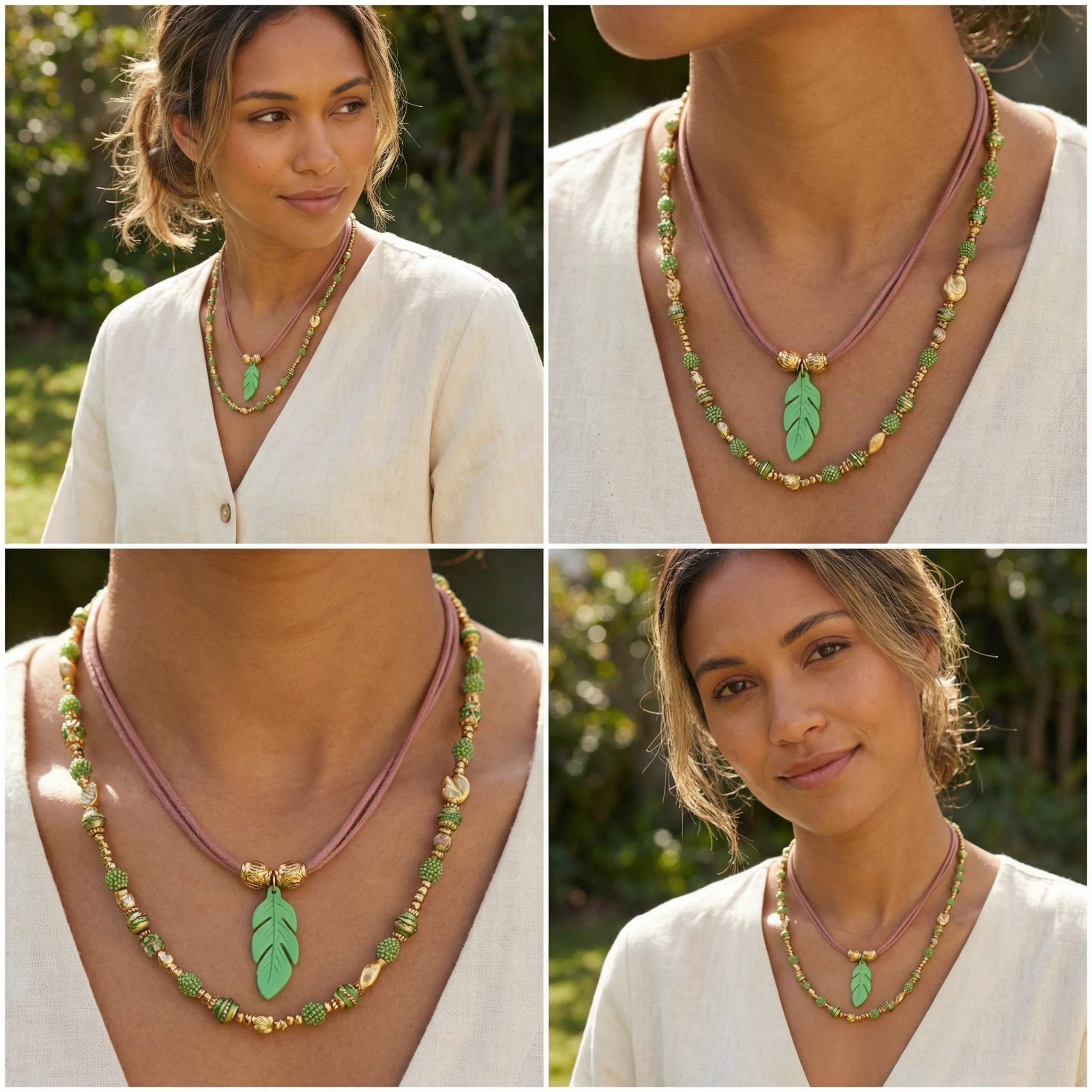 שילוב שתי שכבות – חוט עור עם תליון עלים ירוקים ושרשרת חרוזים ירוקים וזהובים. מראה טבעי, רענן ובעל נוכחות בוהו עדינה.