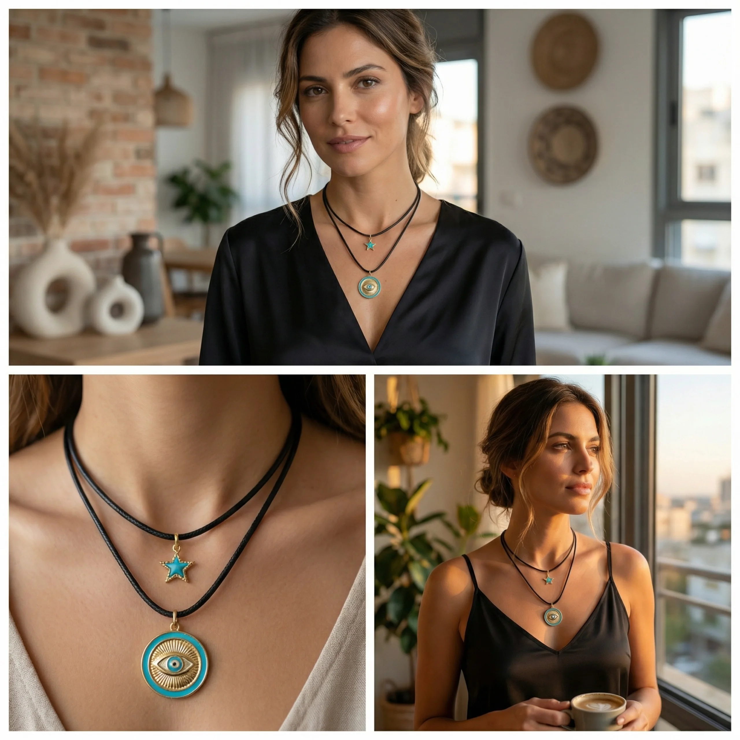 שתי שכבות חוט שחור – העליונה עם כוכב קטן בגוון טורקיז וזהב, והתחתונה עם תליון עגול מעוטר בעין מרכזית מוקפת אבני טורקיז. שילוב עדין בין אלמנט שמירה לעיצוב מודרני עם עומק צבעוני.