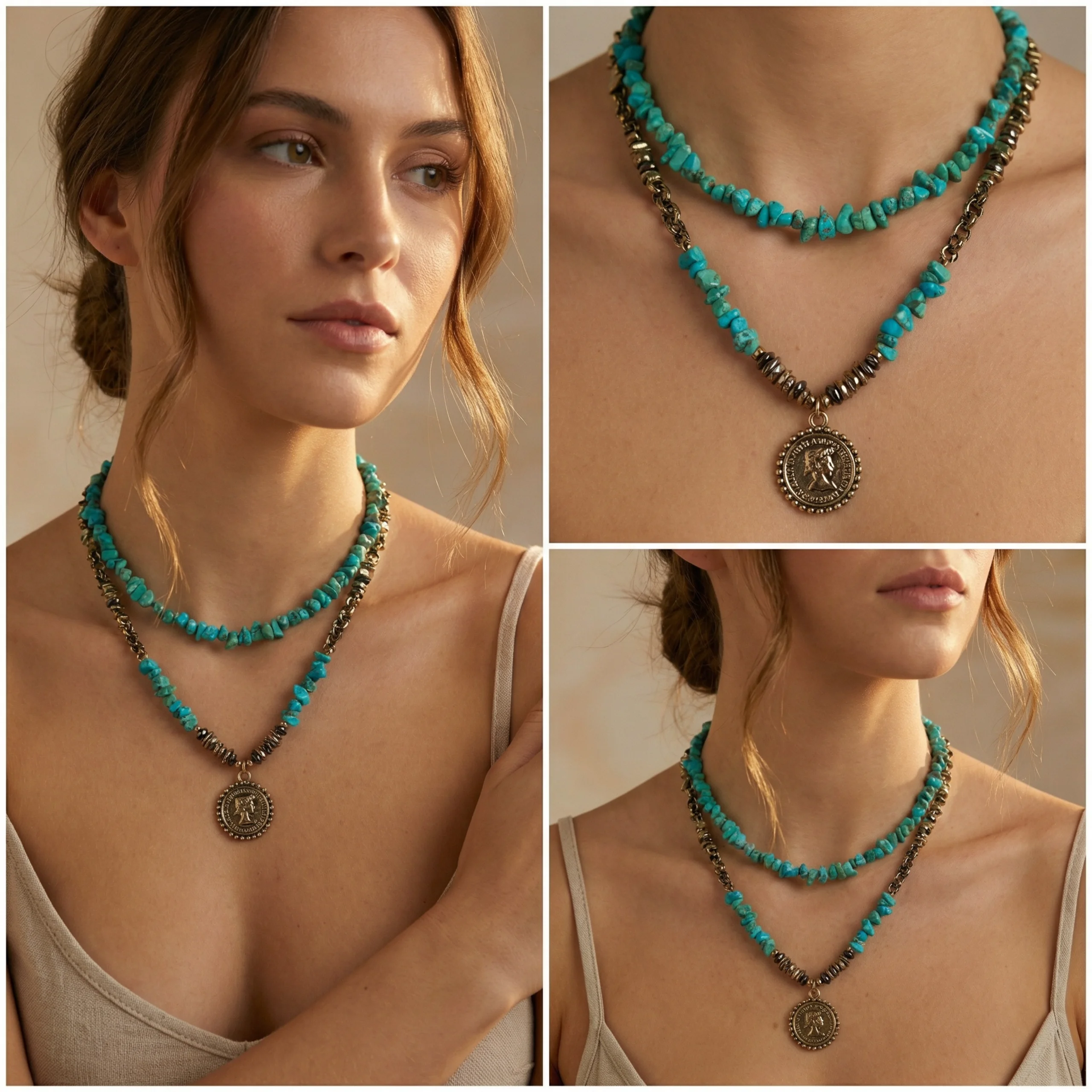 שילוב אבני טורקיז עם שרשרת חוליות זהב ותליון מטבע מרכזי. מראה חם, עשיר ובעל אופי קלאסי-בוהו.