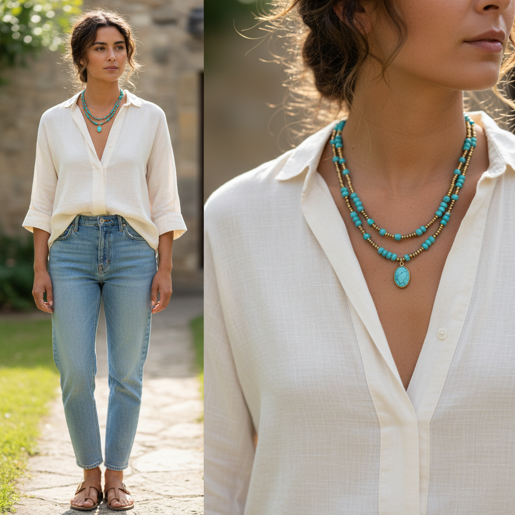 פריט בוהו-שיק קלאסי, עם תליון טורקיז עגול קטן ממוסגר בזהב.