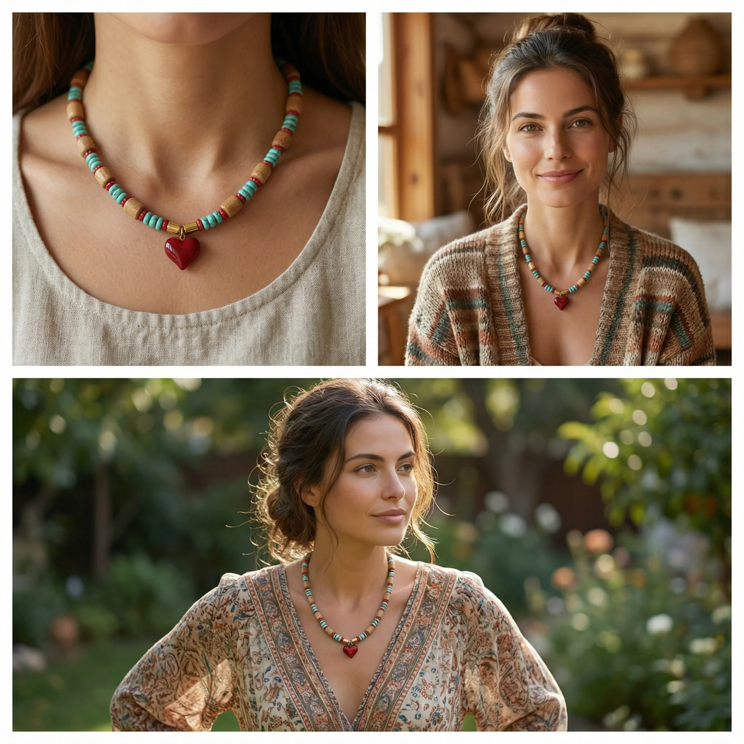 תליון לב קריסטל אדום במרכז, המעניק מראה בוהמי רומנטי.