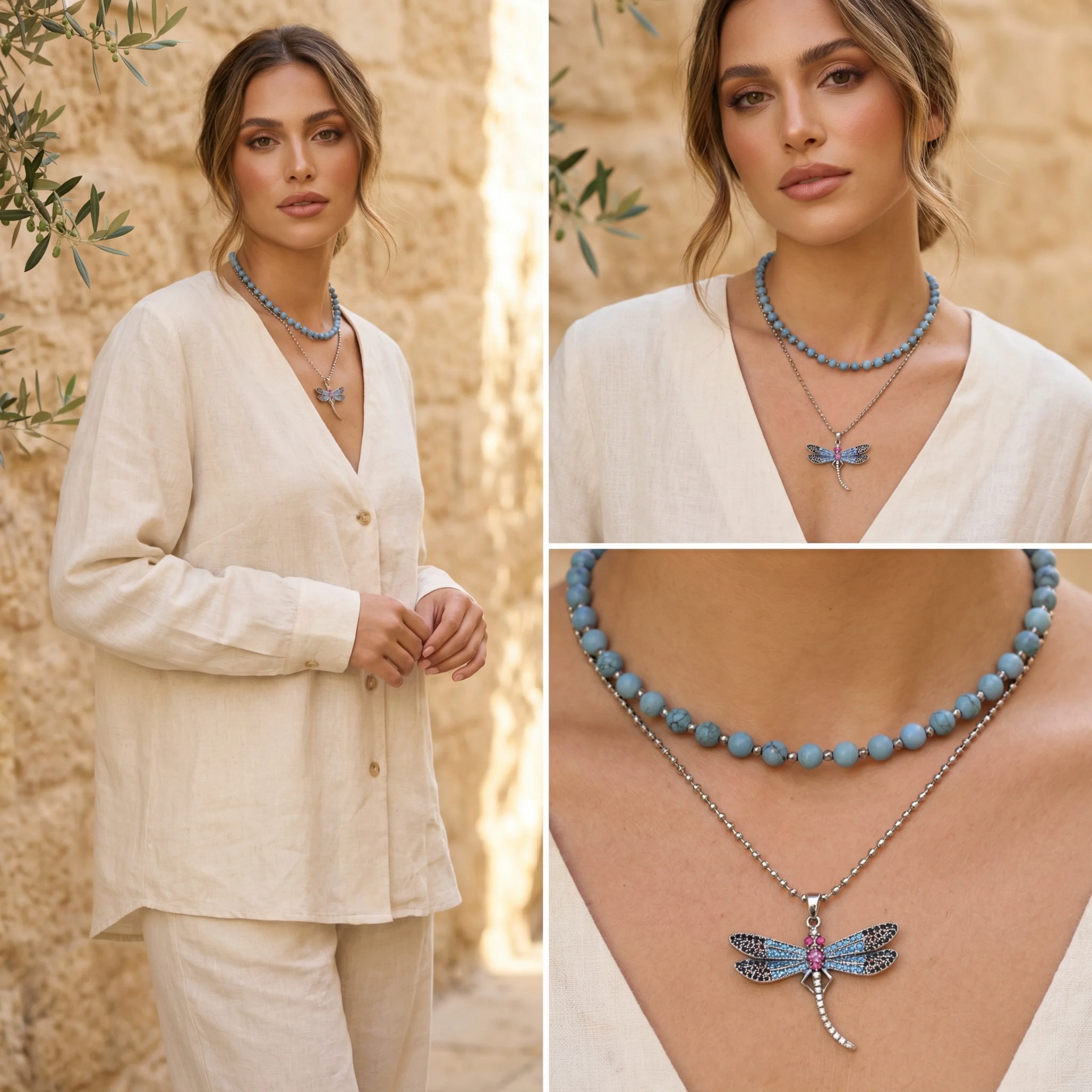 שילוב שתי שכבות – חרוזי טורקיז עדינים ושרשרת כדוריות כהה. במרכז תליון שפירית משובץ בגוונים כחולים וסגולים. עיצוב מלא חיים עם מראה קליל אך מודגש.