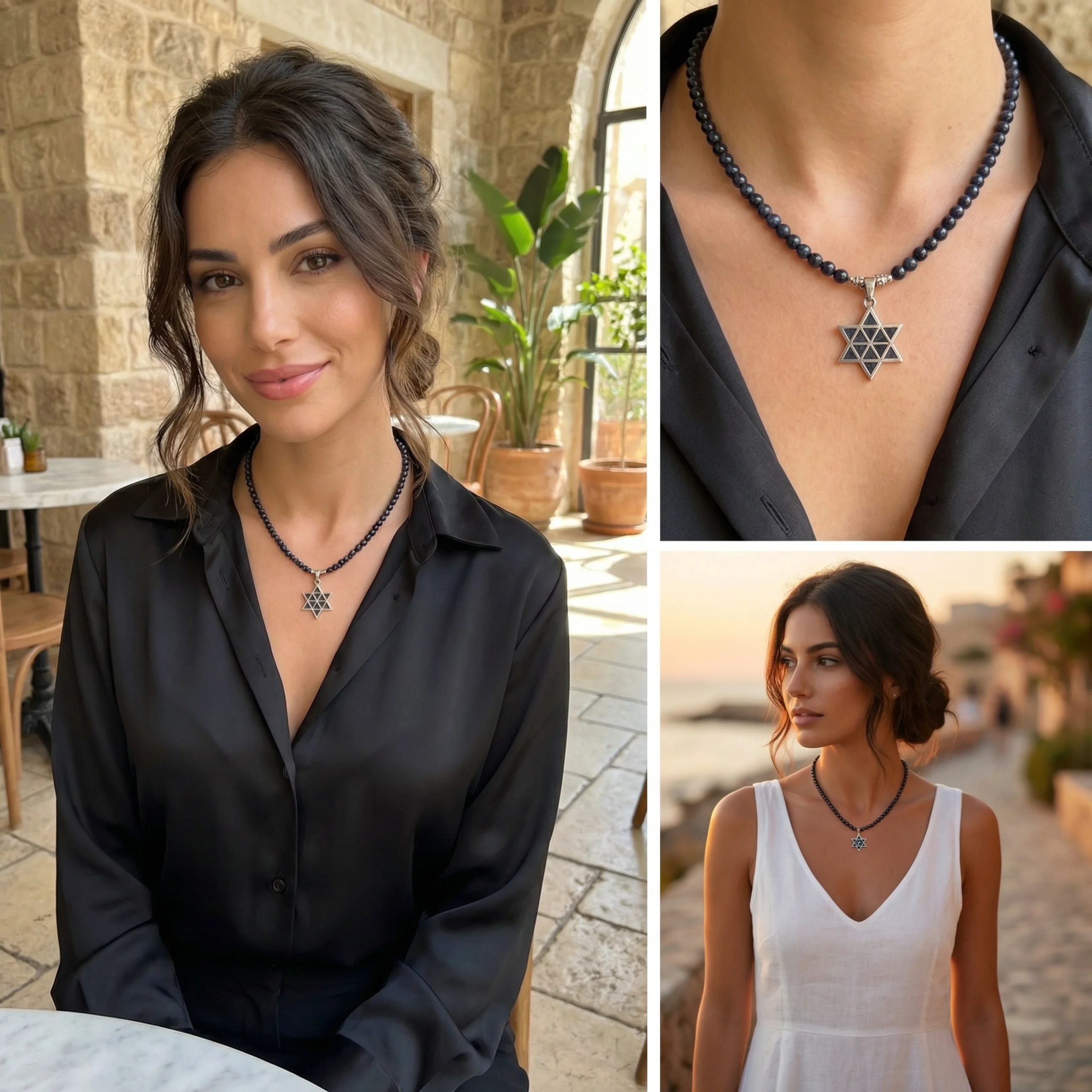 שרשרת חרוזים שחורים בגימור מבריק עם תליון מגן דוד מרכזי. הקו נקי ובעל נוכחות רגועה אך ברורה. פריט קלאסי עם משמעות וסגנון מאופק.