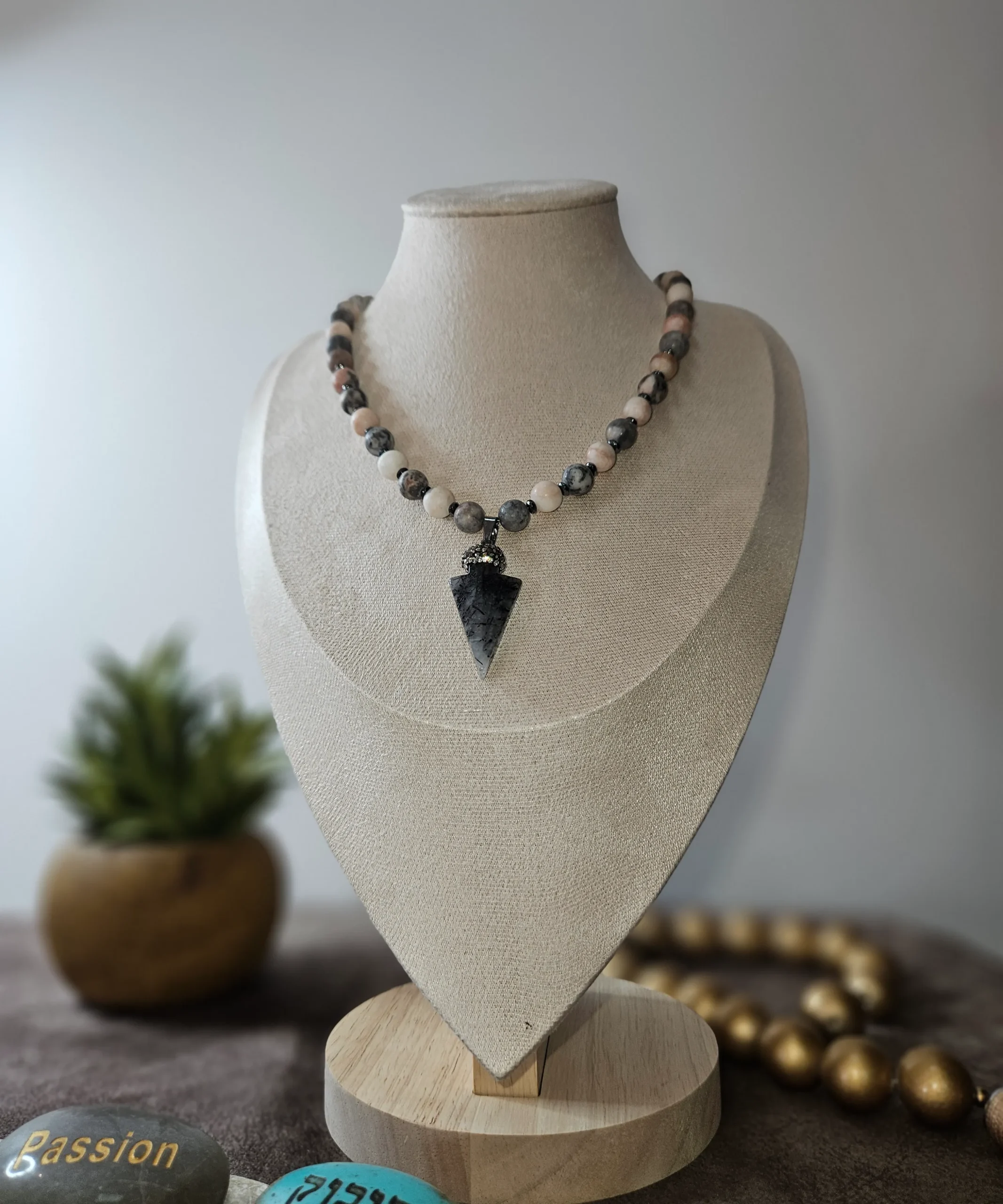 "אביגיל" היא איזון קלאסי בין רכות לנחישות. שרשרת קולר מאבני ג'ספר טבעיות בגימור מאט, המשלבות גווני ורוד פודרה ואפור יוקרתי. תליון החץ הדרמטי עשוי מאותה אבן. ענדי אותה כתזכורת יומיומית ליופי שלך וליכולת שלך לכבוש כל יעד.