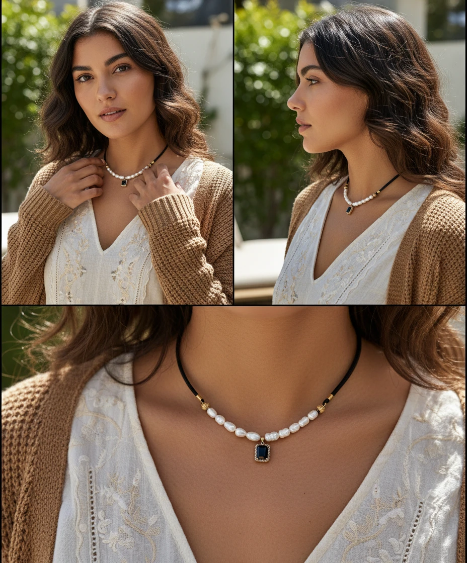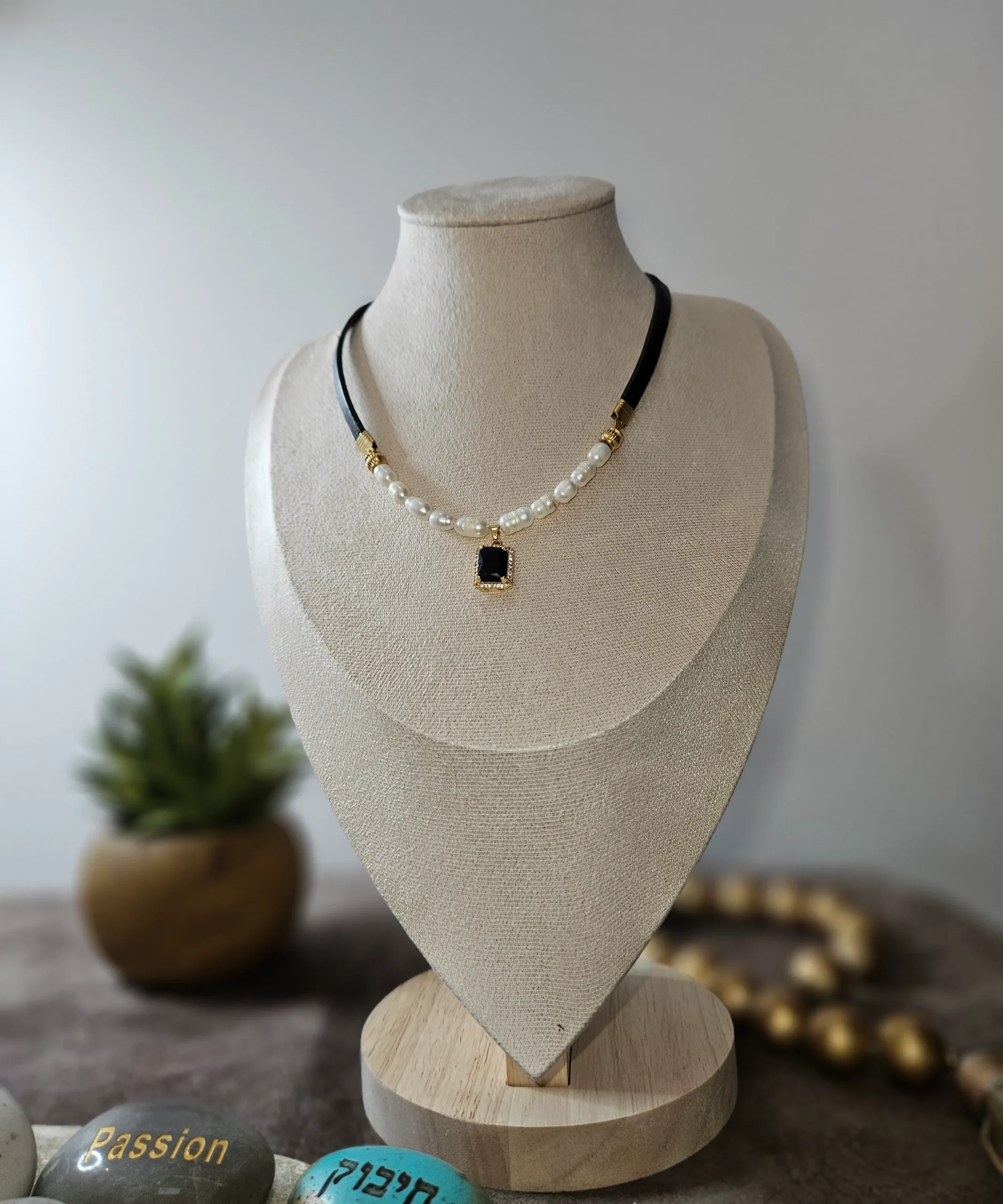 היוקרה המרובעת. שילוב עור ופניני מים מתוקים עם תליון אבן אוניקס שחורה ממוסגרת זהב – הצהרה מתוחכמת.