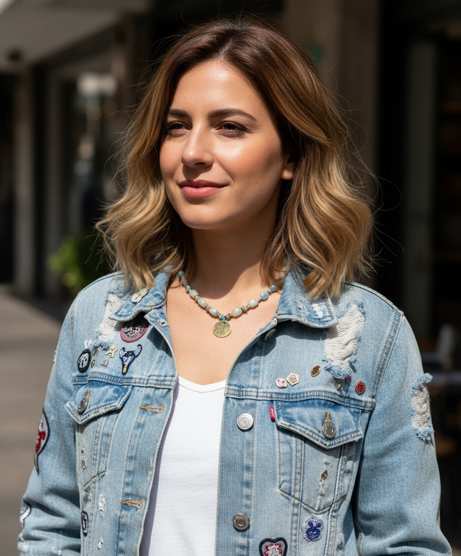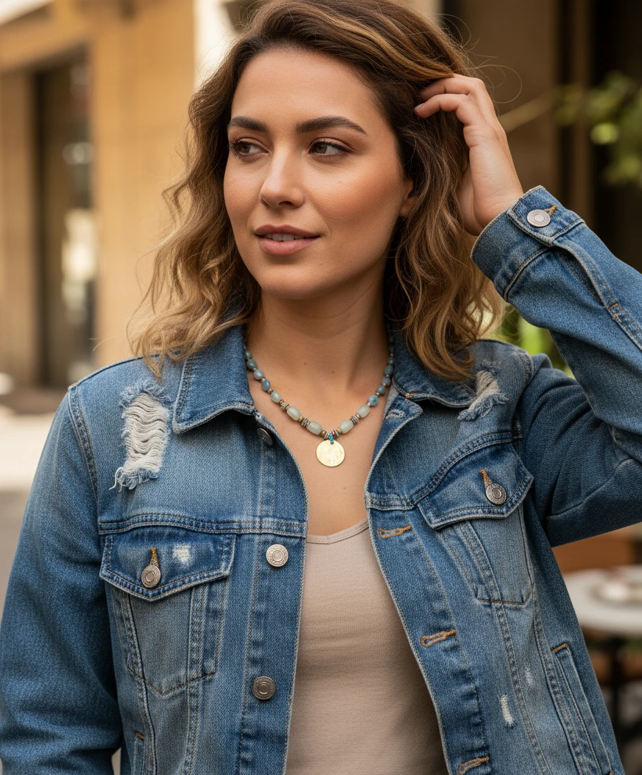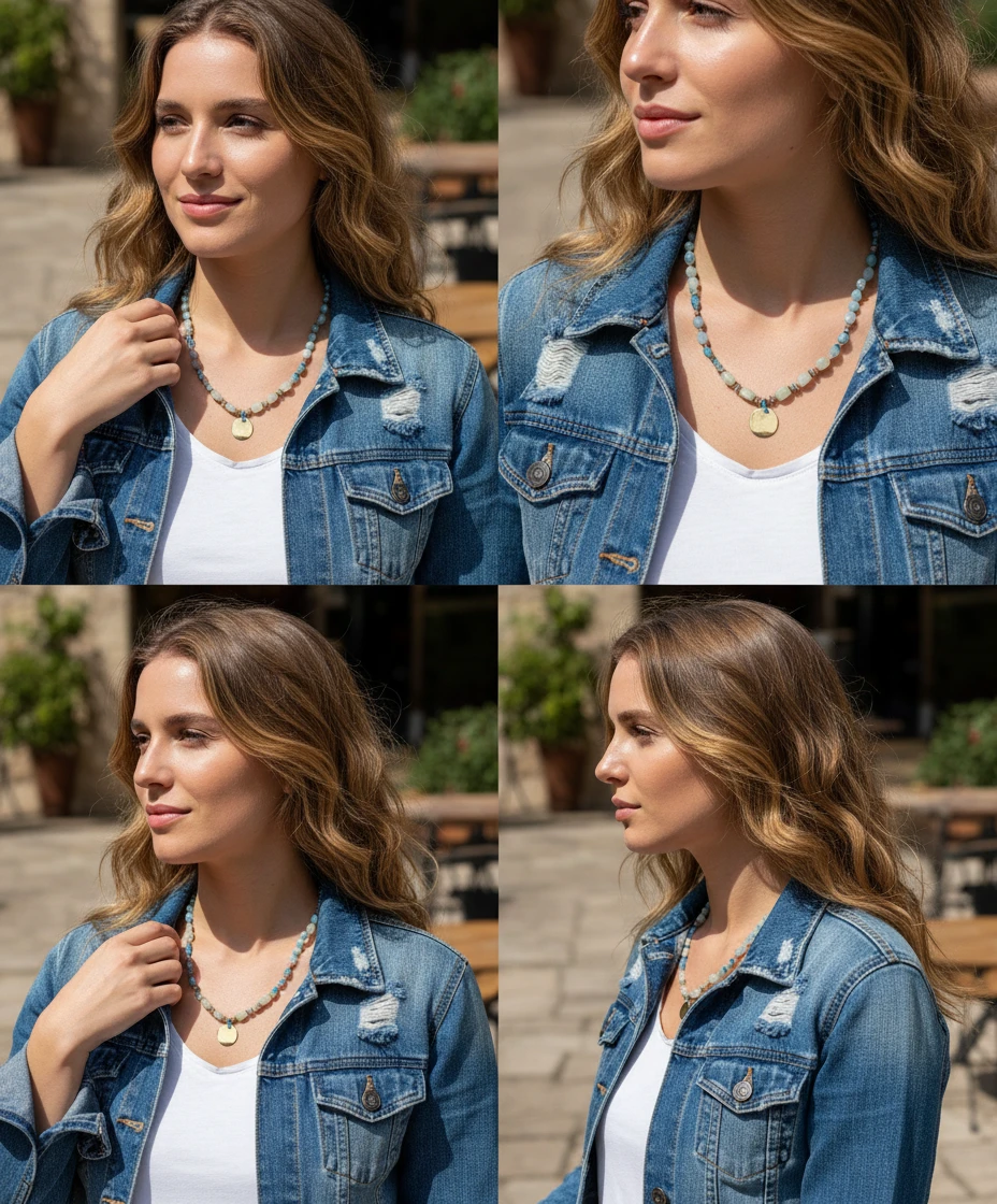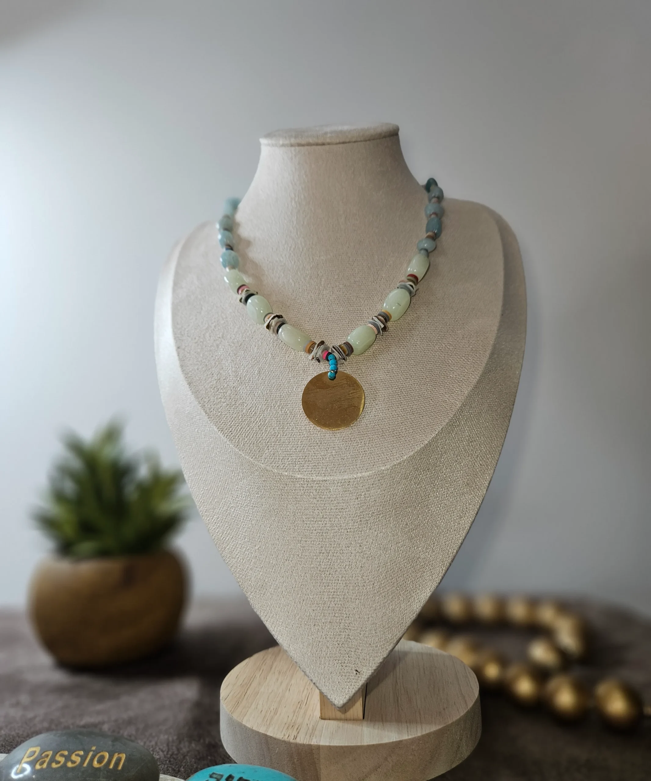 "אלונה" היא יצירה בוהו-שיקית ואקלקטית. שילוב של אבני מים ירוקות-תכולות בצורות לא אחידות. תליון המטבע העגול הוא סמל לחיבור לשורשים ולאנרגיית המזל. יופי טבעי, קליל ומלא כוונות טובות.