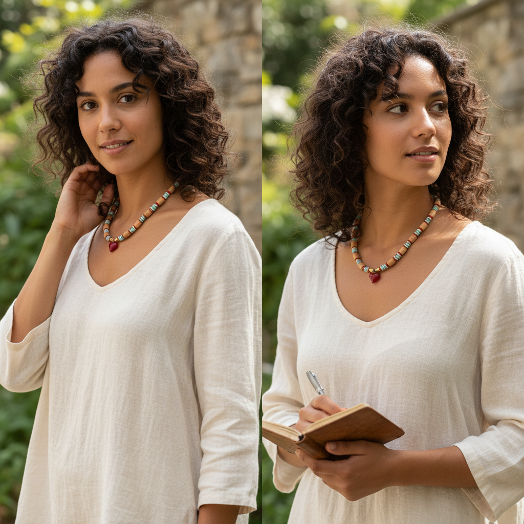 "רנה" היא שרשרת חמה ואותנטית, המשלבת חרוזים עשויים חומרים טבעיים עם אבני טורקיז רעננות. תליון הלב הקריסטלי, בגוון אדום בוהק, נישא במרכז כסמל לאהבה ותשוקה. העיצוב משדר אווירה של טבע ואומנות. כיוון שנוצרה פעם אחת בלבד, שרשרת 1 מכל 1 זו היא המתנה המושלמת לביטוי אהבה ייחודית, או כפריט אספנות אישי ומלא משמעות.